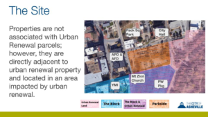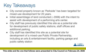The City of Asheville is considering the construction of a new performing arts center on a site it calls “Parkside,” currently used as a municipal parking lot. A recent City presentation charted a timeline that begins in 2006, described the site as having been “targeted for mixed-use development” since that time, and noted that it is not “associated with Urban Renewal,” though it sits “adjacent” to “an area impacted by (that program).”