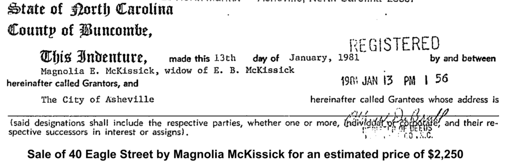 Under the threat of eminent domain litigation from the City, some owners agreed to sell. In January 1981, Magnolia McKissick, mother of Civil Rights leader Floyd McKissick, sold her family’s property at 40 Eagle Street to the City for roughly $2,250, which translates into $8,100 in today’s dollars. The family had purchased the property for $1,600 in 1946, which translates into $27,000 in today’s dollars—so a net loss in generational wealth of the equivalent of $25,400.