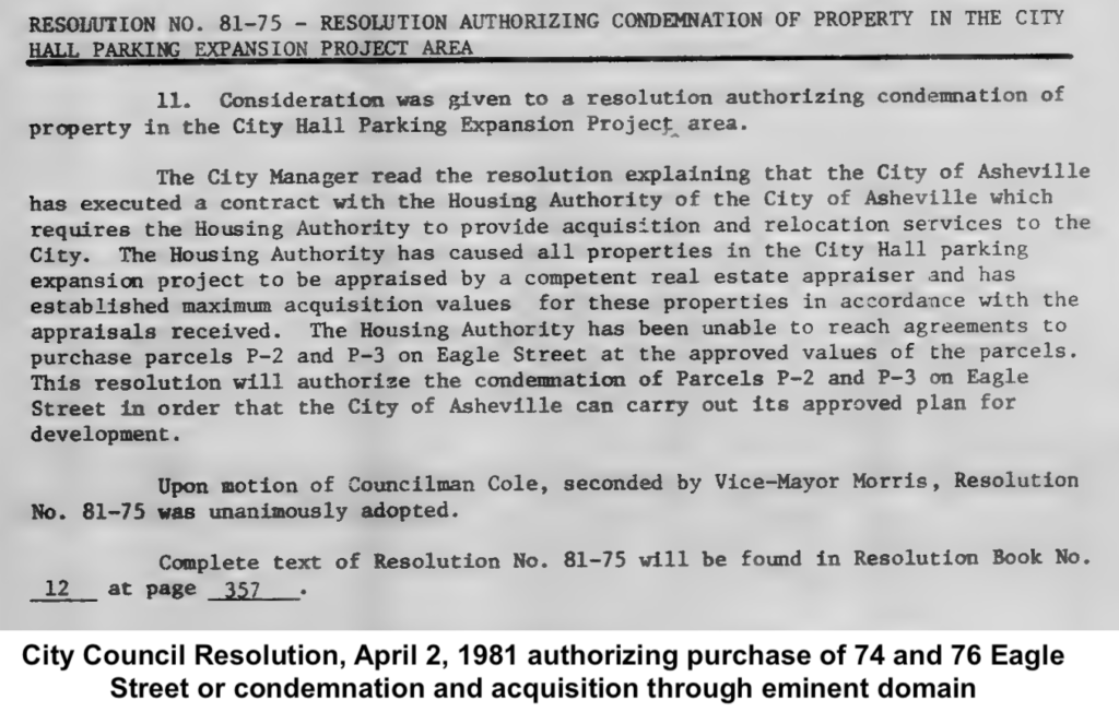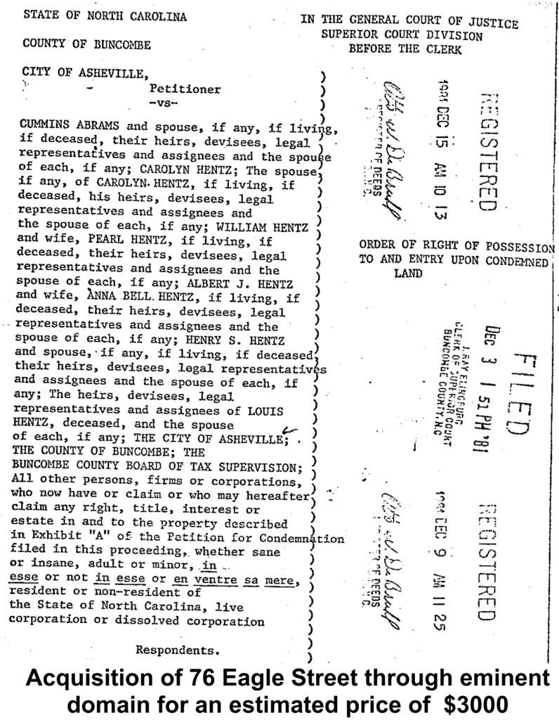 Others did not—or could not—agree to the City’s terms. Just a few months after buying the McKissick lot, the Asheville City Council authorized the use of eminent domain to take the remaining properties at 74 and 76 Eagle Street.