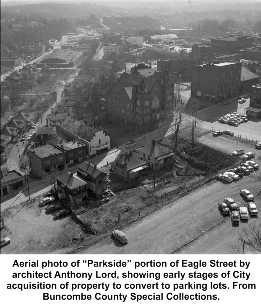 In 2003, the City completed its assembly of the site by acquiring additional parcels from Buncombe County, including land that had long been in public ownership. By that point, the transformation of the Eagle Street block from residential use to parking was complete.