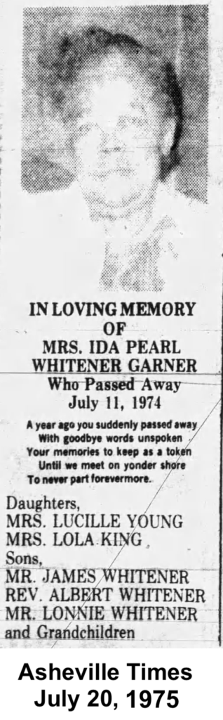 The life of Ida Pearl Whitener Garner, who rented furnished rooms at 76 Eagle for decades, offers a glimpse into that continuity. She raised a family whose presence extended into the next generation, and when she died in 1974, she left behind children, grandchildren, and a homeplace that had anchored her family’s life in Asheville. Her life, rooted in this place, spanned the very period when the City began to reshape neighborhoods like this one. Within a decade of her death, her home—and others like it—would be gone.