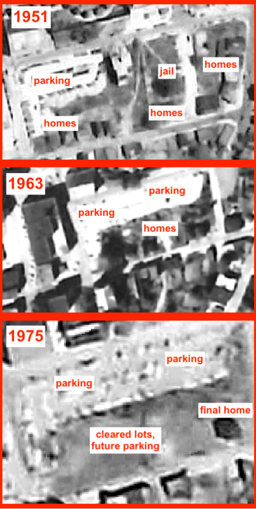 By looking at aerial photographs, you can see the progression from a mostly residential neighborhood in the 50’s to a parking lot and just one remaining home in the late 70’s. Once that home was gone, in the early 1980s, this block of Eagle Street—once home to generations of Black Asheville residents—had been transformed into surface parking. The City government achieved its goal. But the cost was borne by the families who had lived there, and by a community that lost housing, wealth, inheritance, and a piece of its physical presence in the center of the city.