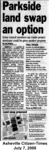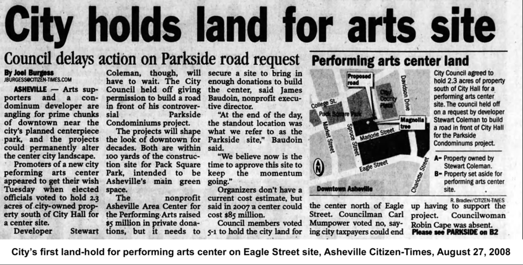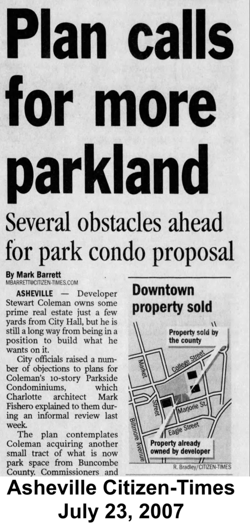 Soon afterward, developer Stewart Coleman proposed building high-end condominiums near Pack Square. He called the project “Parkside.” The proposal proved controversial. Critics raised concerns about the scale of the development, its proximity to City Hall, and the potential loss of a historic magnolia tree. The heirs of George W. Pack, whose gift helped create Pack Square, objected to the plan.