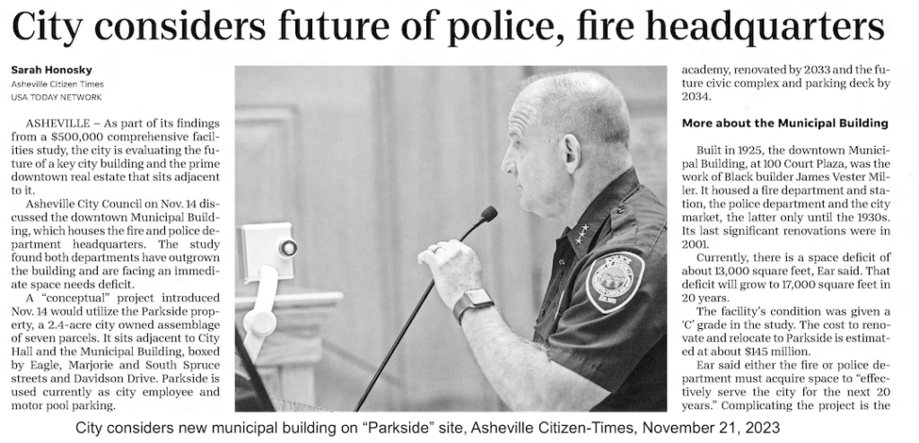 City Council directed the Grove Park Inn in 2004 to extend “targeted invitations” to organizations such as the YMI Cultural Center and Eagle Market Street Development Corporation as they developed their plan. Nearly twenty years later, during the one public conversation about the fire/police headquarter proposal, one City Council member asked whether the land might instead be considered in the context of repairing harm caused by urban renewal in nearby neighborhoods. The response from the City Manager was succinct: “No.” There was no further discussion.
