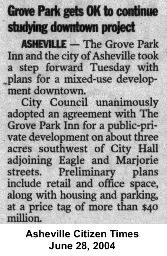 Just a year later, however, the Grove Park Inn withdrew. After “extensive research and consulting,” the company concluded the project was not “economically feasible.” The land remained in public hands, and the City once again began searching for a private partner to shape its future.