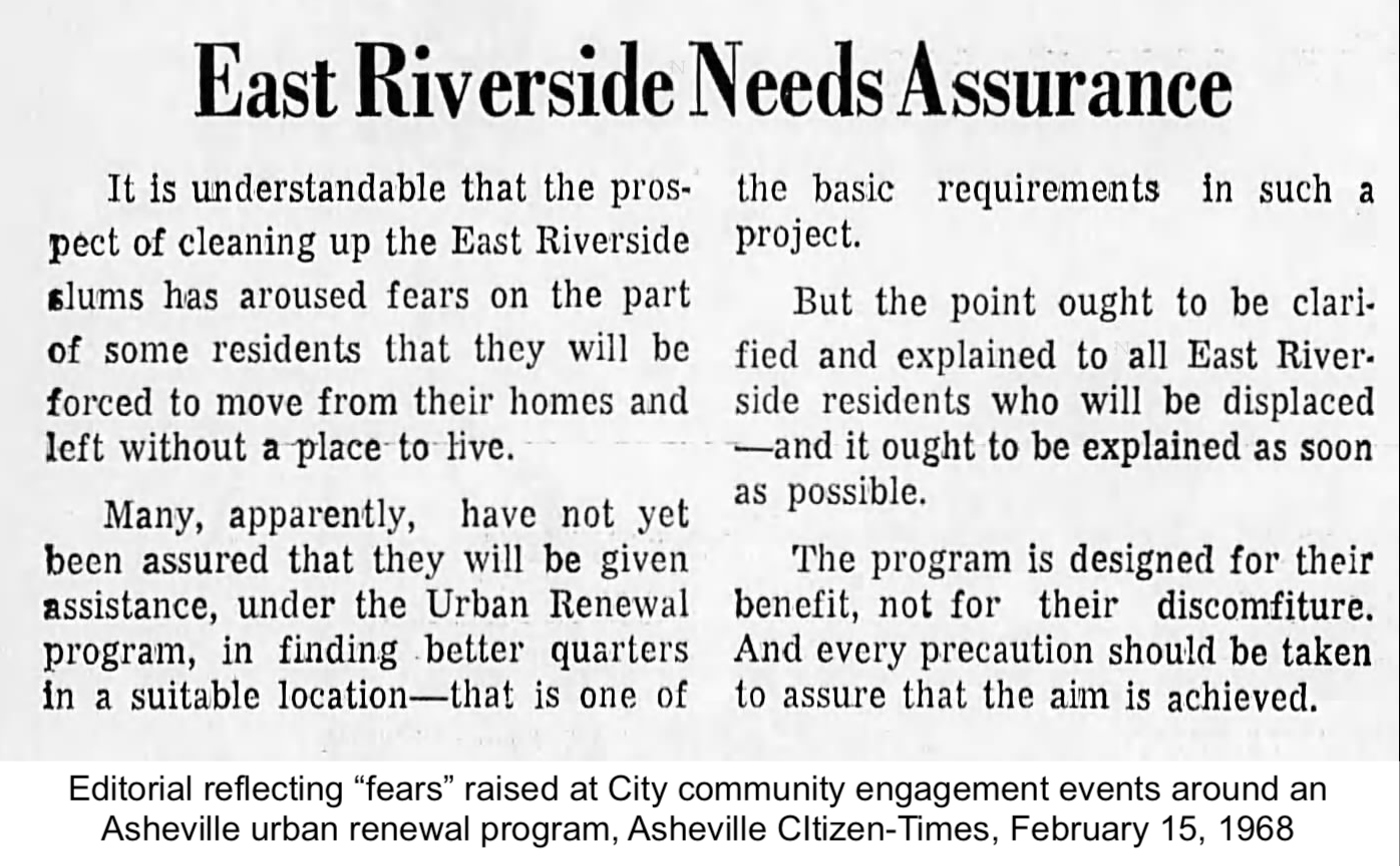This time can and should be different. In 2020, the Asheville City Council issued a public apology and intention to make amends for the damage done by urban renewal. They adopted a moratorium on selling or rezoning City-owned land connected to that program. That’s why the planned staff presentation for the City Council meeting on Tuesday, March 24 includes a slide that declared that this site is not “associated with Urban Renewal,” though it sits “adjacent” to “an area impacted by [that program].” If the parcel had been acquired via urban renewal, the land hold could not move forward because of the moratorium.