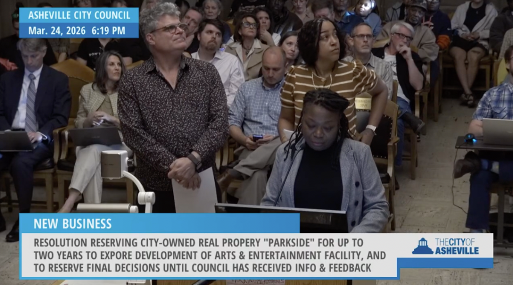 City Council voted unanimously on Tuesday, March 24, to place a two-year land hold on the “Parkside” parcels to explore the building of a downtown performing arts center in Asheville. Importantly, the final approved version of the resolution stipulates that the City will “create and utilize, as part of this process, meaningful and robust partnerships [emphasis added] with the surrounding communities, including but not limited to the Block and East End.” This status of “partner” is of great significance to these communities–earlier drafts had merely offered “engagement”–so this commitment is a win.